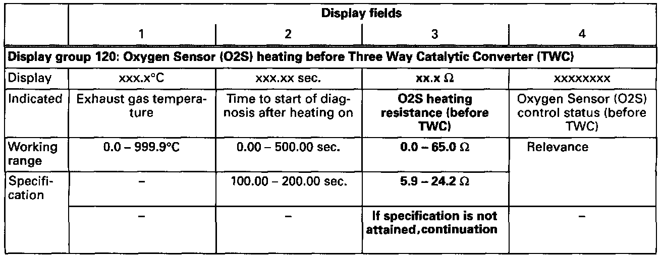 - Check the resistance value for oxygen sensor heating before three way catalytic converter (display field 3).