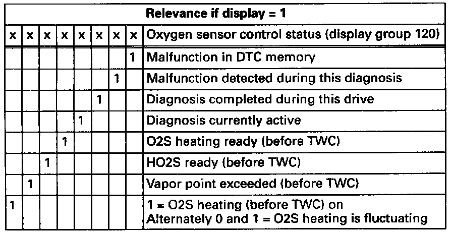 - Check relevance table above, for value of O2S control status, display group 120, display field 4, 1st position from left.