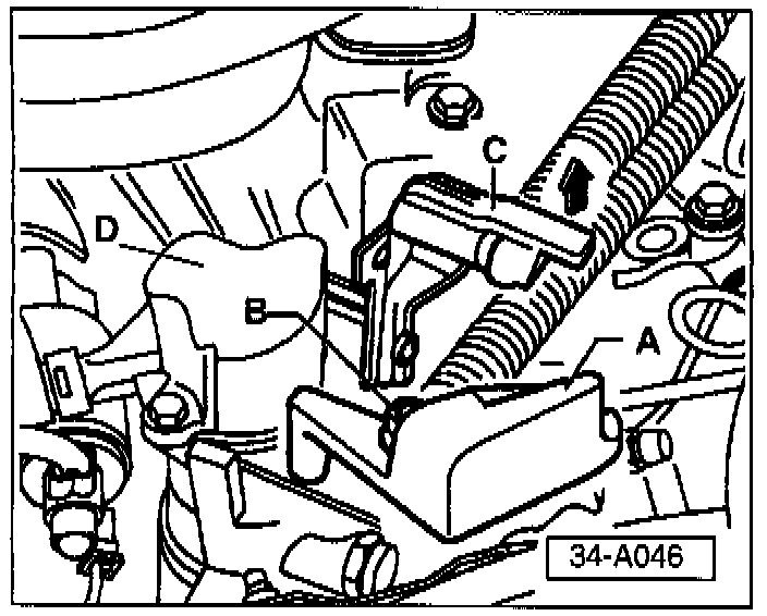 - Disconnect gate selector cable from actuating arm/relay lever -C- by lifting lug in direction of -arrow-.