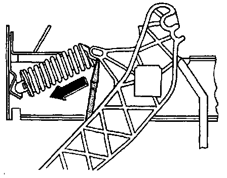 10. Depress the clutch pedal and disconnect the over-center spring from the pedal in direction indicated by the arrow.