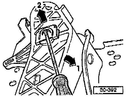 - Remove clutch pedal retaining clip from pivot pin by using screwdriver to press tab in direction of arrow -1- and pressing clip in direction of arrow -2-.
