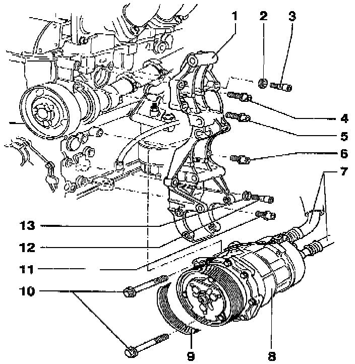 - Remove bolts -10- and remove compressor.