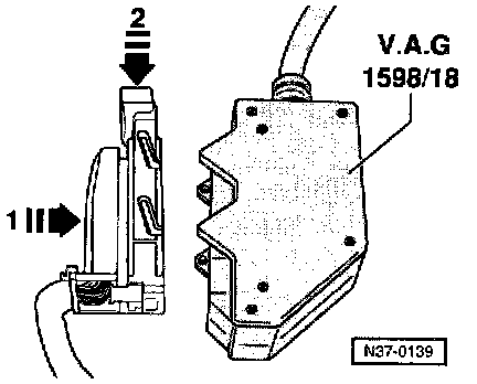 - Install VAG 1598/18 test box onto multi-pin connector-1-and lock, in direction of (arrow -2-).