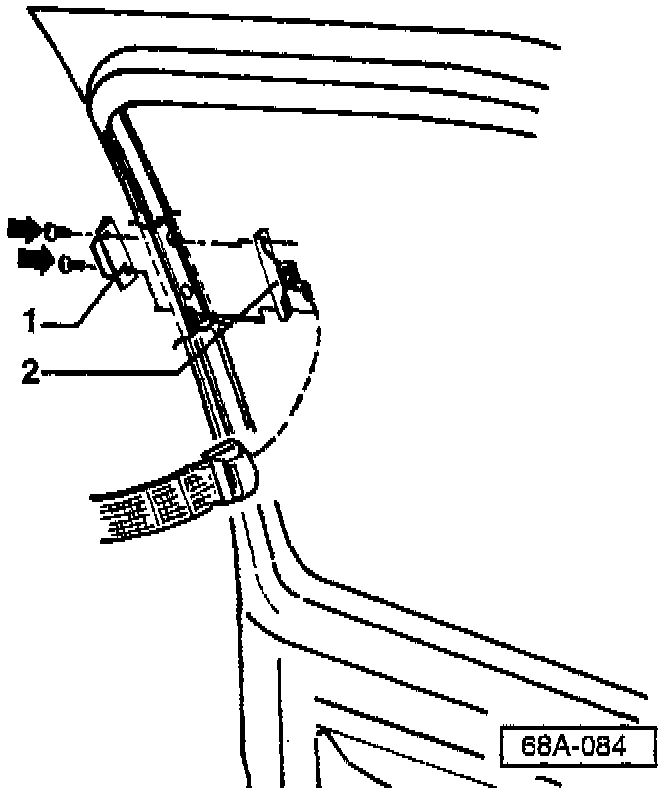 - Install upper door catch (anchor plate) -1- and upper belt buckle support (retaining clamp) -2- into door using screws -arrows-.