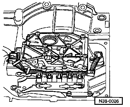 - Disconnect connector at transmission and remove retaining clamp, drain ATF, remove oil pan then remove cable guide.