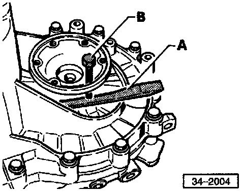 - Position chisel or spacer (A) beneath axle flange and pull flange (right or left) from differential gears by turning bolt (B) (B = a previously removed housing bolt)