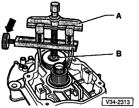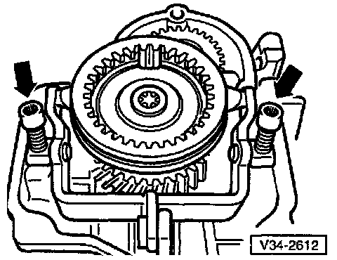 NOTE: When removing the gear make sure that the hooks do not bend outward. If necessary tighten screw (arrow). After removing, check 5th gear for damage.