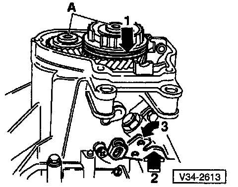 - Remove bolts (A) for synchro-hub and 5th gear. To do this, engage 5th gear (arrow 1) and 1st gear (arrows 2 and 3)