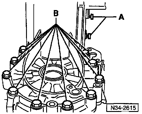 ^ Place chisel or spacer (A) under axle flange and pull flange from differential gears by turning bolt (B) (B) = previously removed housing bolt)