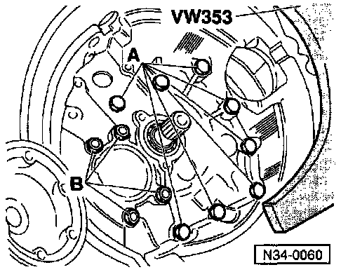 - Remove remaining bolts (A) from inside clutch housing (attaching clutch housing to transmission housing)