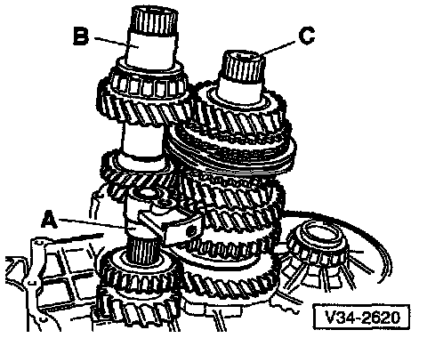 - Remove reverse gear (A), input shaft (B) and output shaft (C), in that order, from clutch housing