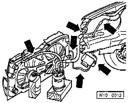 - Remove A/C compressor and lay to one side with hood lock carrier arranged such that the refrigerant lines -arrows- are not stressed