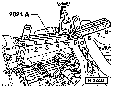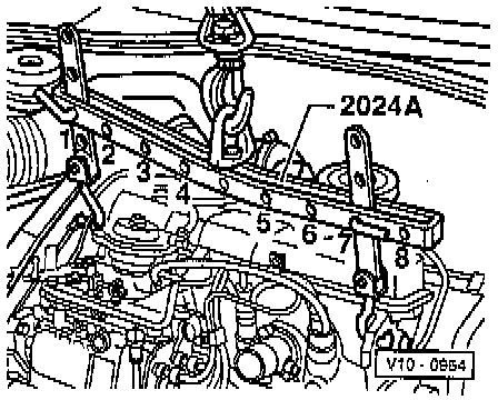 The positions marked 7 to 4 on the lifting bar must be located at the pulley end of the engine block