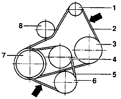 NOTE: Check belt tension at points indicated -arrows-.