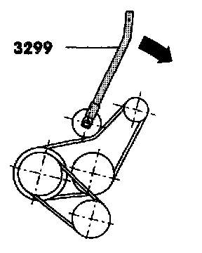 - Lift bell tensioner with ribbed belt installation tool 3299 to relieve belt tension.