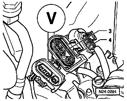 - Connect multimeter using test leads from VW 1594 to measure voltage between terminals 3 and 4 (ECM side of harness connector).