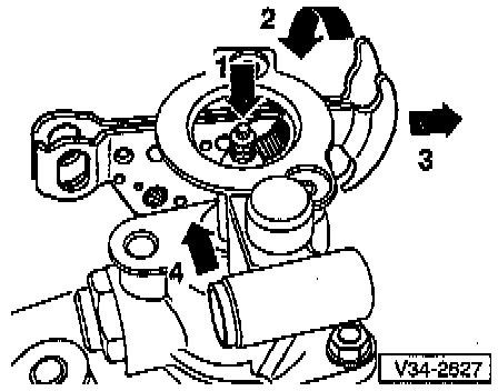 - Swivel gearshift lever (direction of arrow -2-) and pull outward (direction of arrow -3-), while guiding in area of balance weight bracket (arrow -4-).