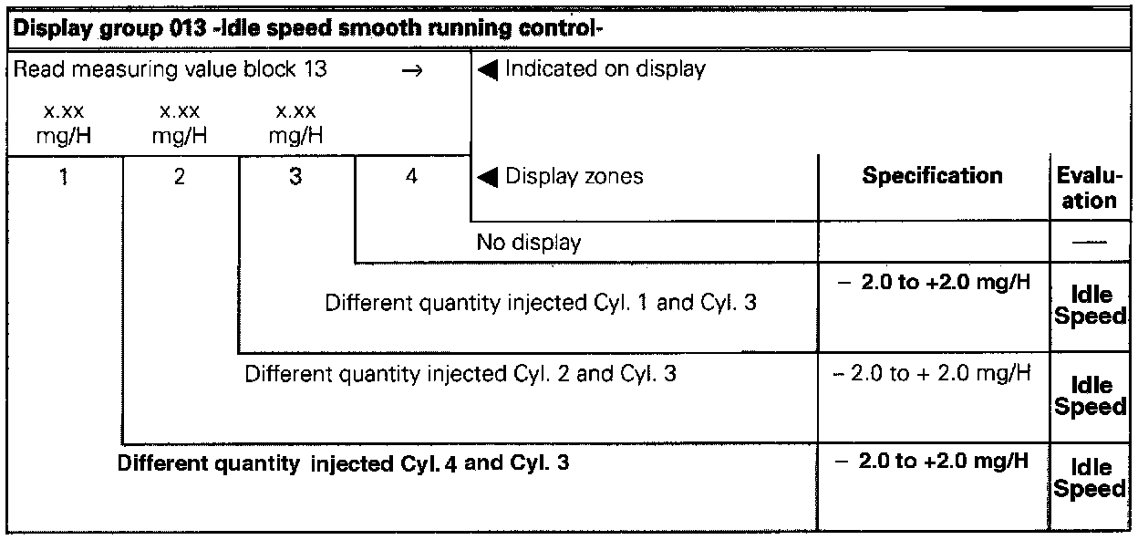 The measuring value block displays the injected quantity differences of the individual cylinders compared with cylinder No. 3 which is required to ensure an even engine idling speed.