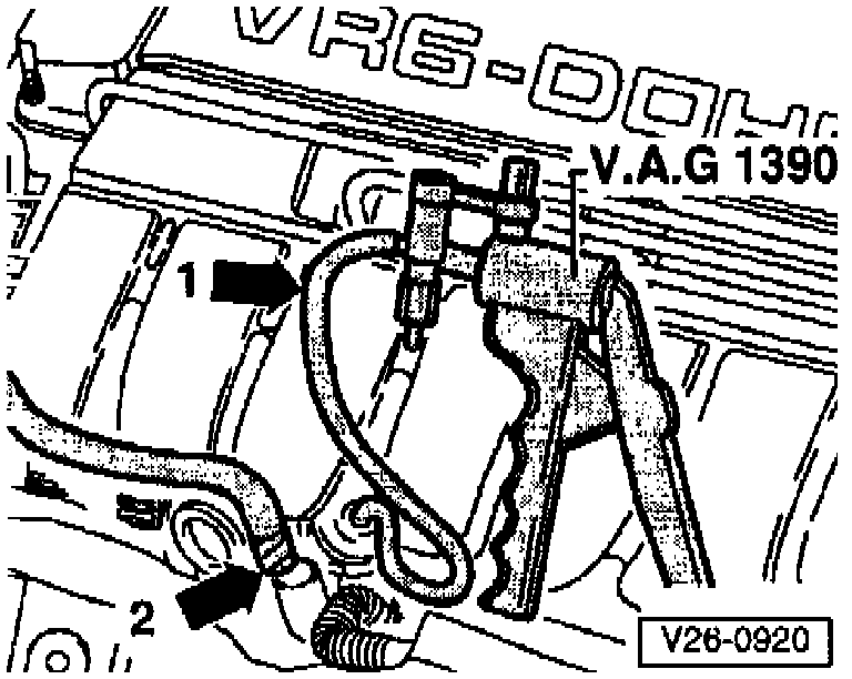 - Connect VAG 1390 hand vacuum pump to disconnected vacuum hose -1- and AIR Inlet Valve.