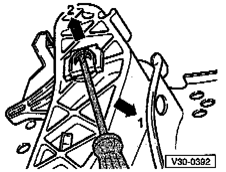 - Remove clutch pedal securing clip from pivot pin- by prying tab in direction of arrow -1- with screwdriver, then pushing clip off in direction indicated by arrow -2-.