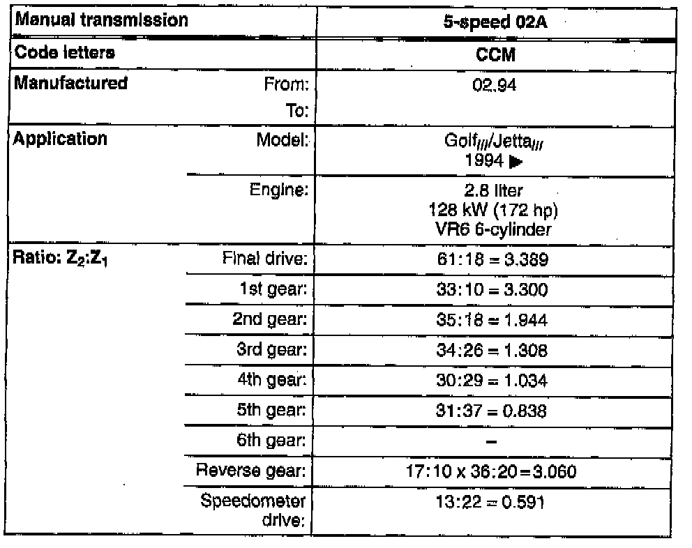 MANUAL TRANSMISSION 02A, IDENTIFYING- The 5-speed manual transmission 02A is installed in Golf, GTI and Jetta vehicles equipped the 2.8 liter VR6 6-cylinder engine.