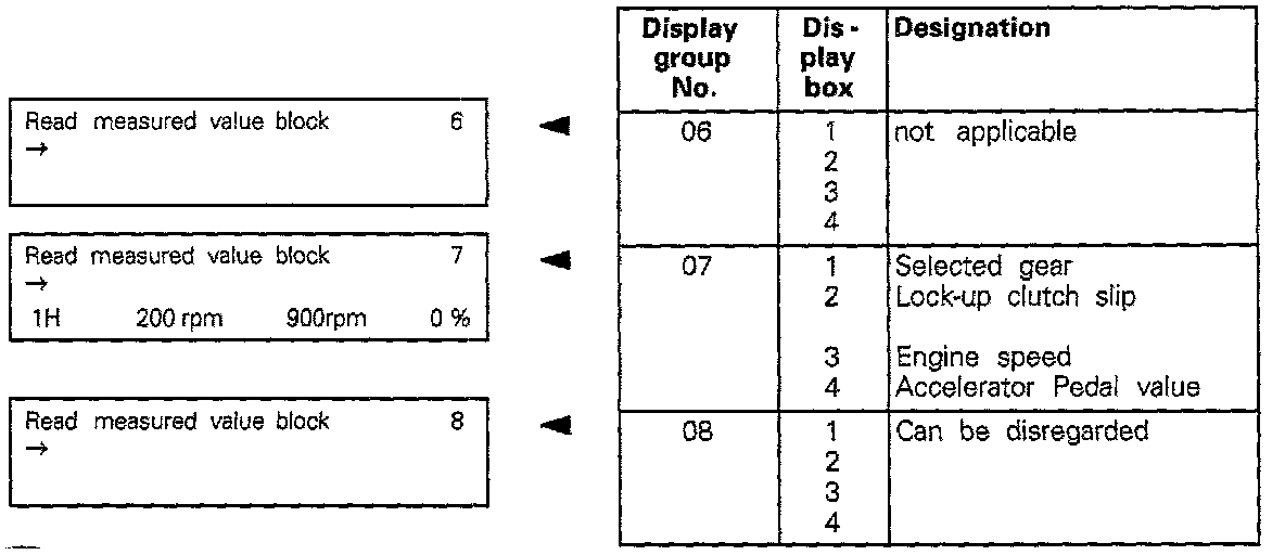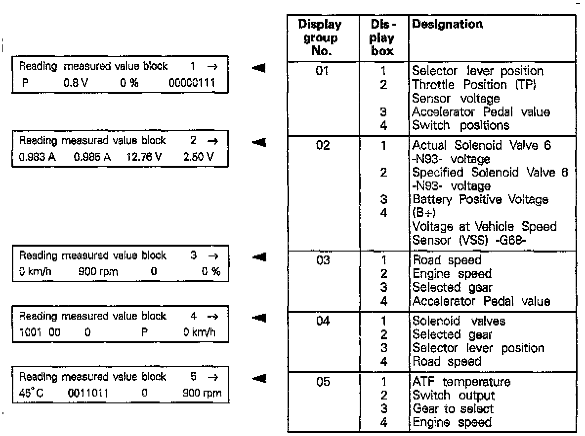 MEASURED VALUE BLOCK - READING- Connect Scan Tool (ST) VAG 1551 and enter address word "02 Transmission electronics" and advance until "Select function XX" is indicated on display.