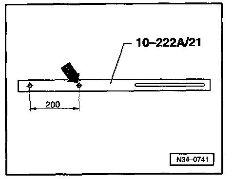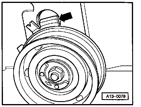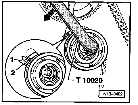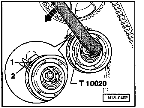 - Tension camshaft drive belt. Do this by turning eccentric to left (direction of arrow) with two hole pin wrench T 10020 onto stop.