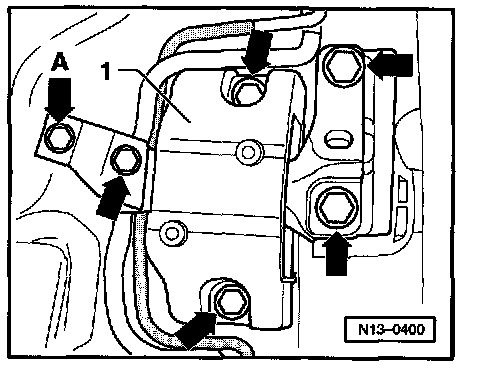 - Remove bolts -arrows- and engine mount -1- as follows;