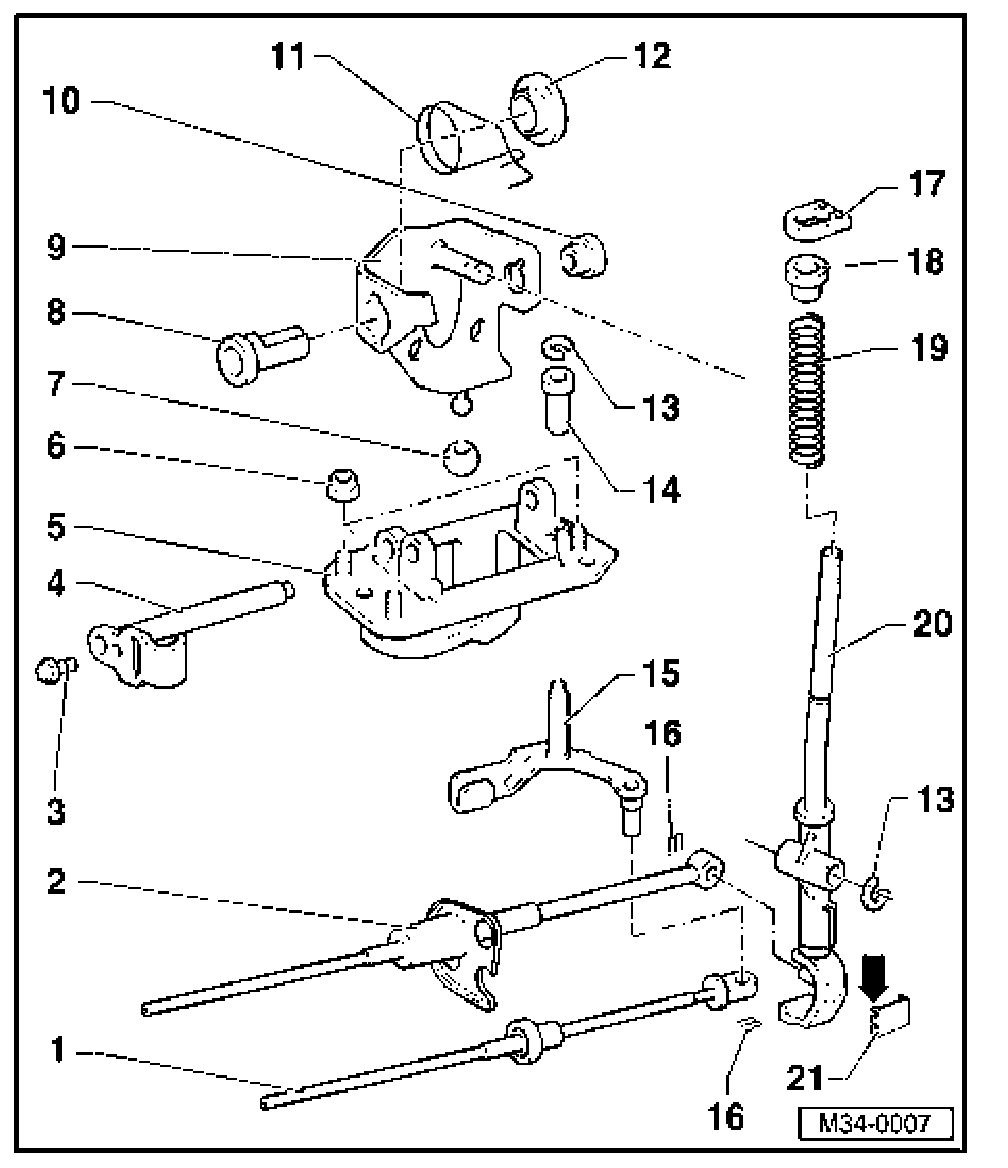 - Installation position: pins (arrow) face toward gear selector lever guide.