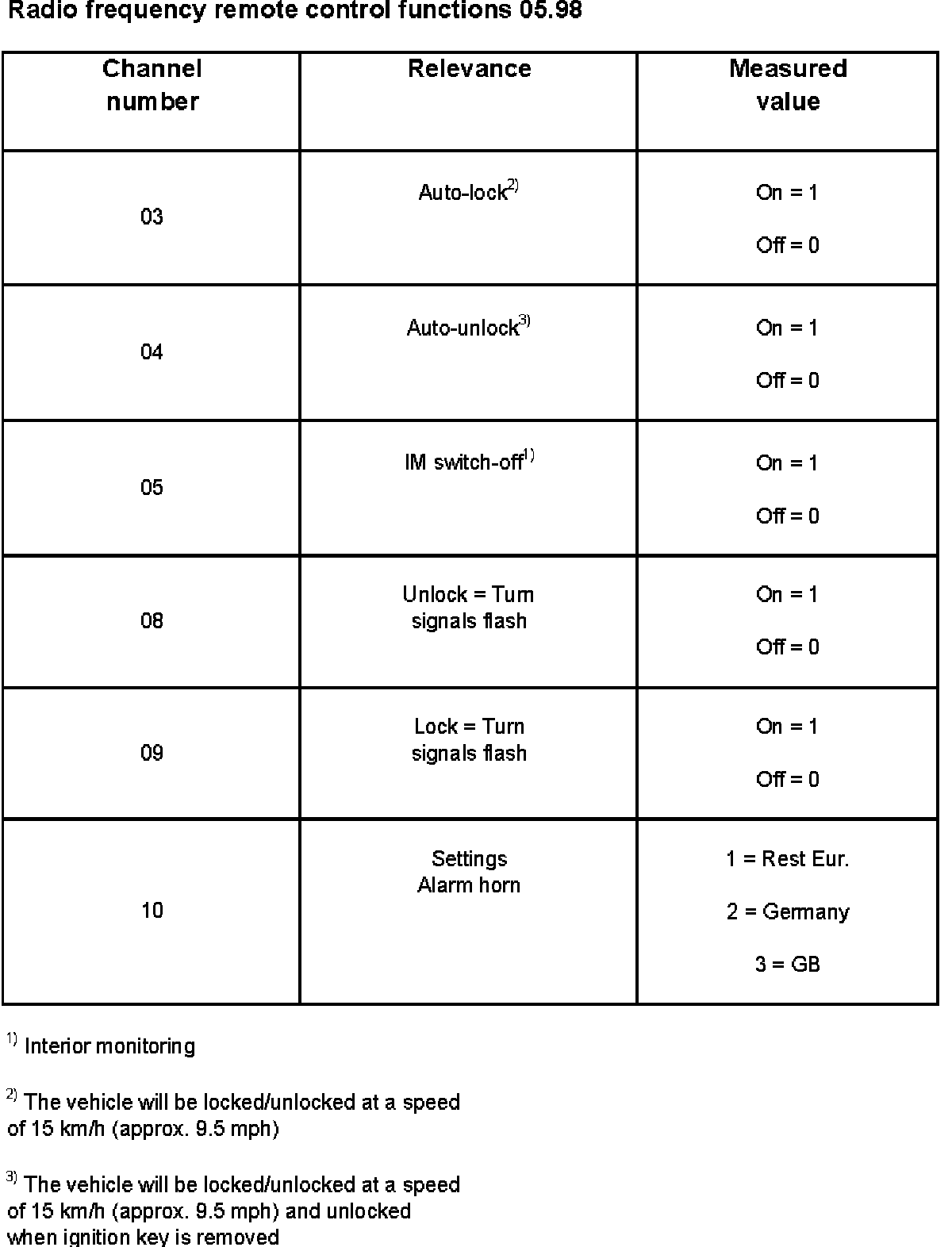 The various functions listed in the table can be called up and matched to each ignition key in any combination by selecting the channel numbers 03 - 10.