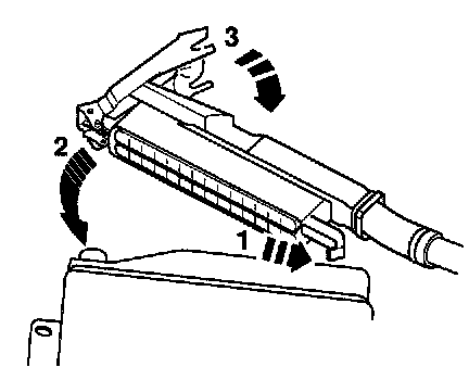 - Connect multi-pin harness connector to Transmission Control Module (TCM) -J217- harness connector housing -1- by swinging in -2- and then lock -3-.