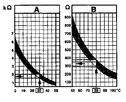 - 30 °C is range A and corresponds to a resistance of 1.5 to 2.0 K Ohms