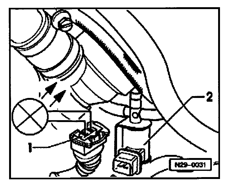 - Disconnect harness connector -1- from EVAP canister purge regulator valve -2- and connect VAG 1527 B voltage tester to harness connector using jumper wires from VW 1594 adaptor kit