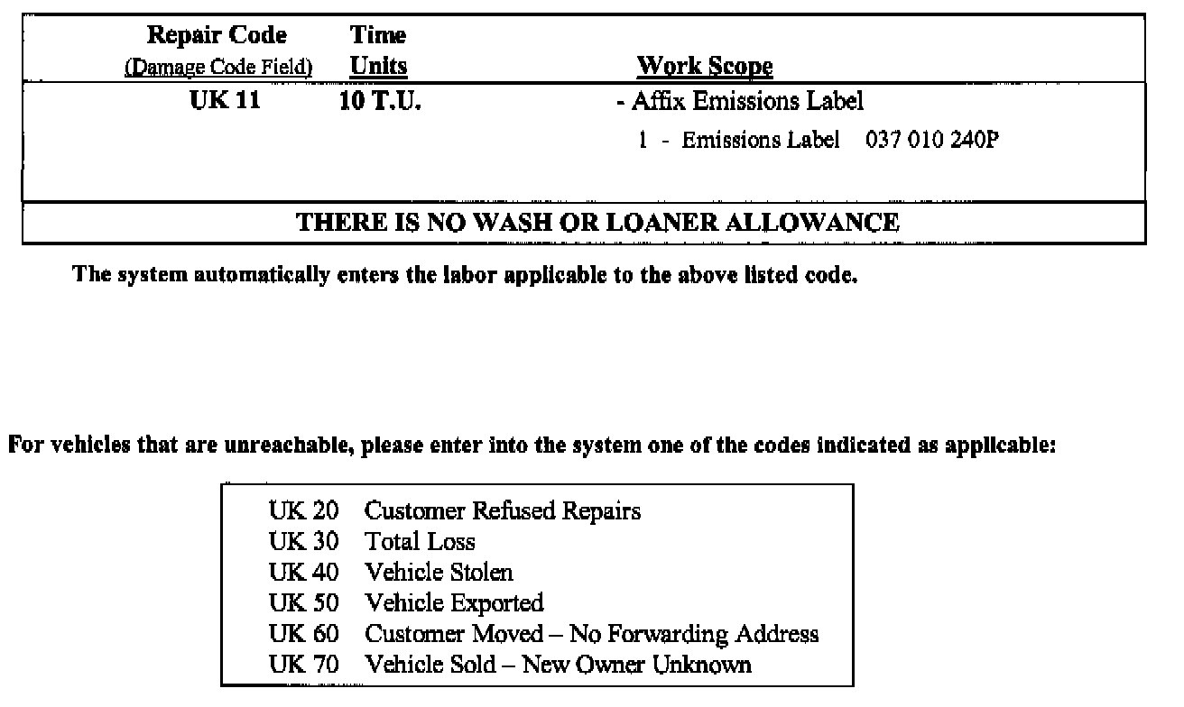 Replacement labels, part number 037 010 240P, which will not be available through parts channels, will be supplied to owners together with the notification letter. However, a small supply of these labels will be mailed to you, prior to owner notification, to accommodate cases where owners have failed to supply the new label to you.
