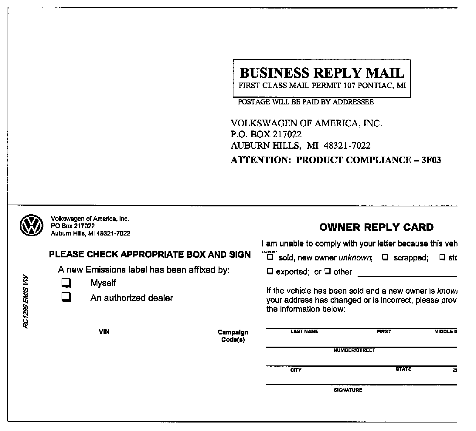 Volkswagen of America, Inc. will notify all known owners of affected vehicles directly by first class mail on or about February 14, 2000. Each notification package will include a new emissions label, installation instructions and a postage-paid "Owner Reply Card" (copy included in circular). Owners will be asked to affix the label themselves or seek the help of an authorized Volkswagen dealer. The self-addressed "Owner Reply Card" is used to confirm that the label replacement has been completed. A copy of the owner notification letter and Owner Reply Card is enclosed for your information.