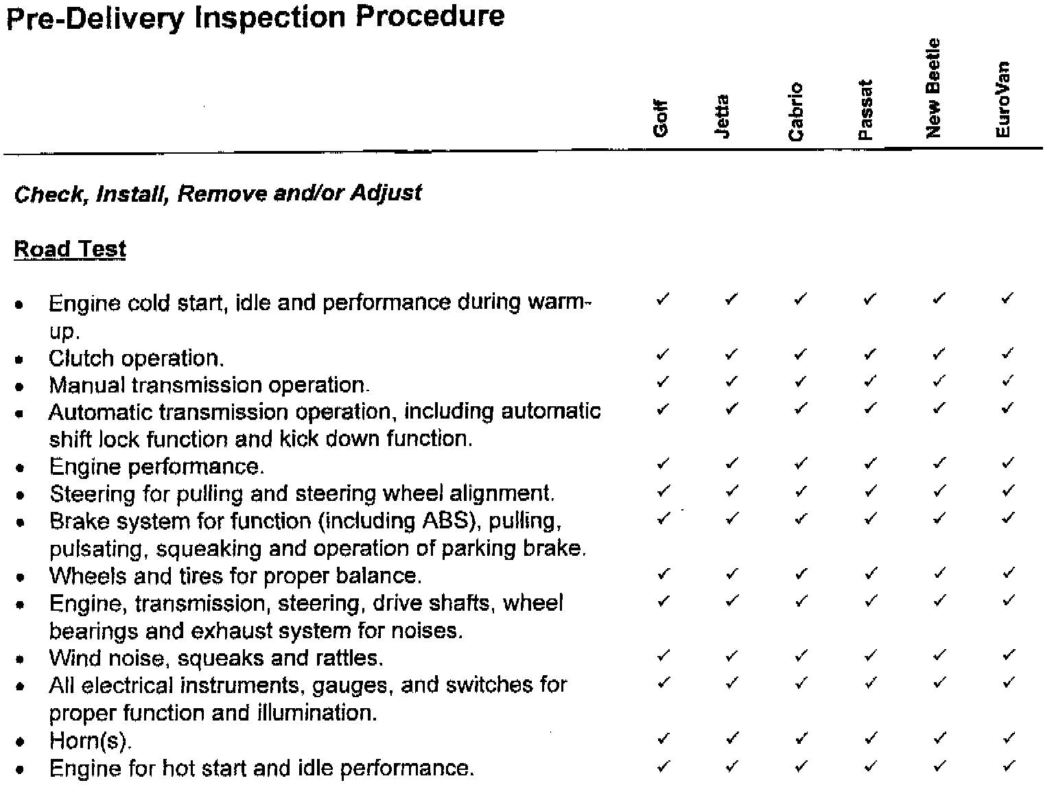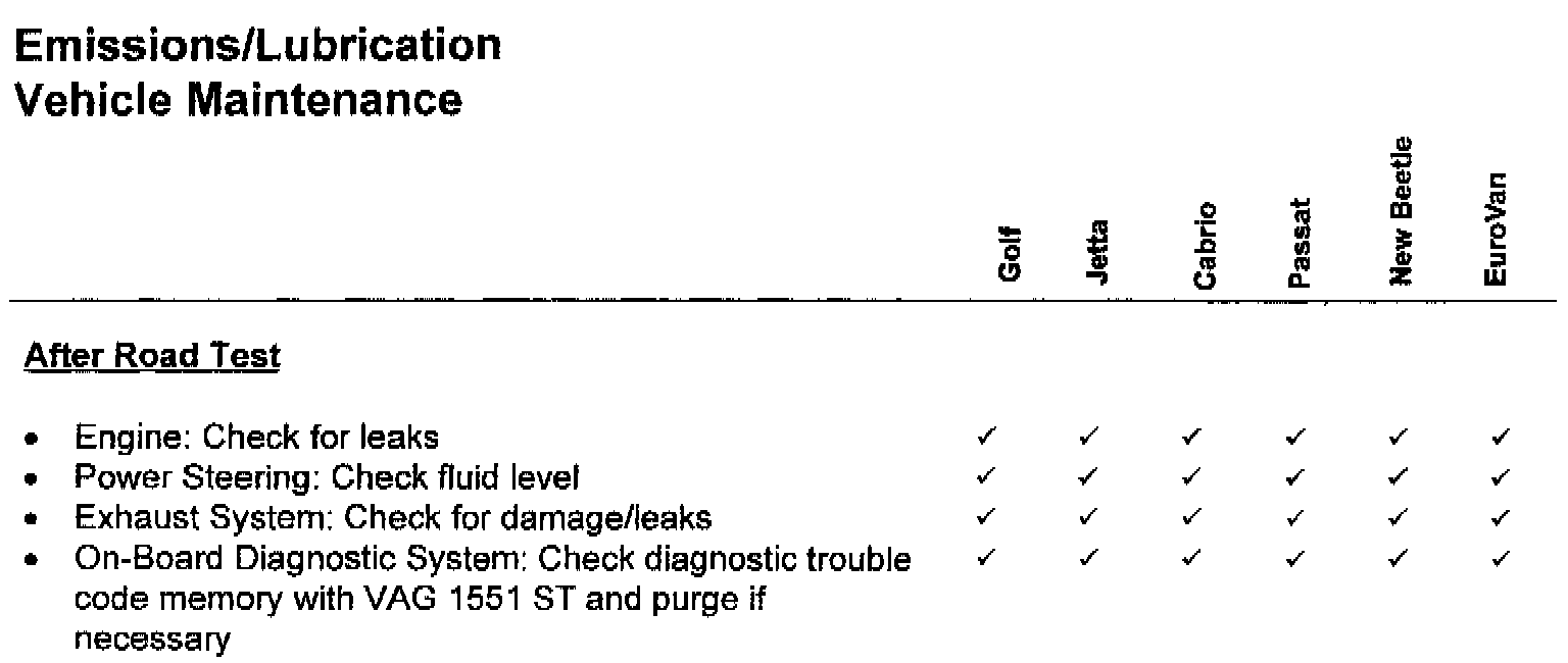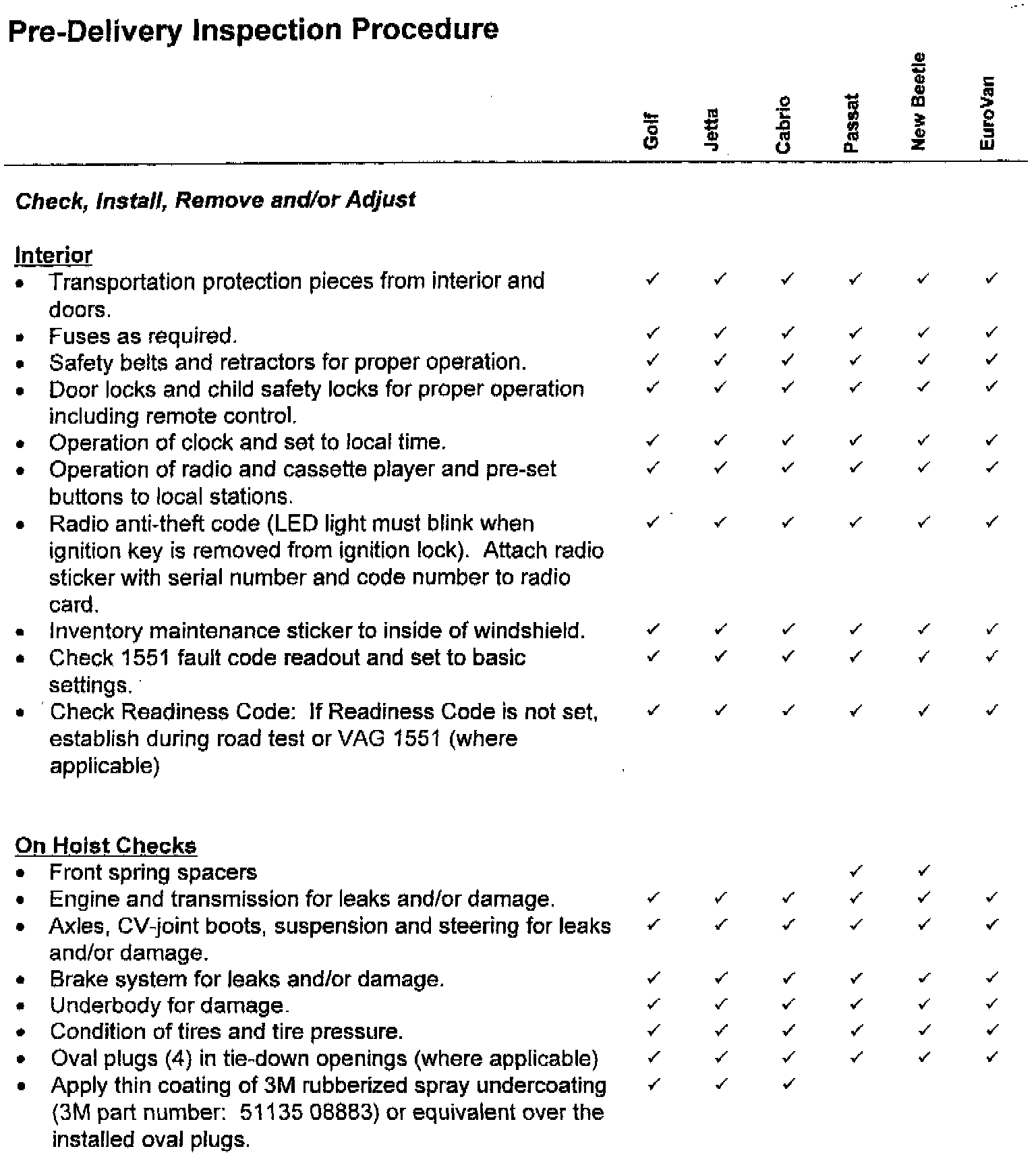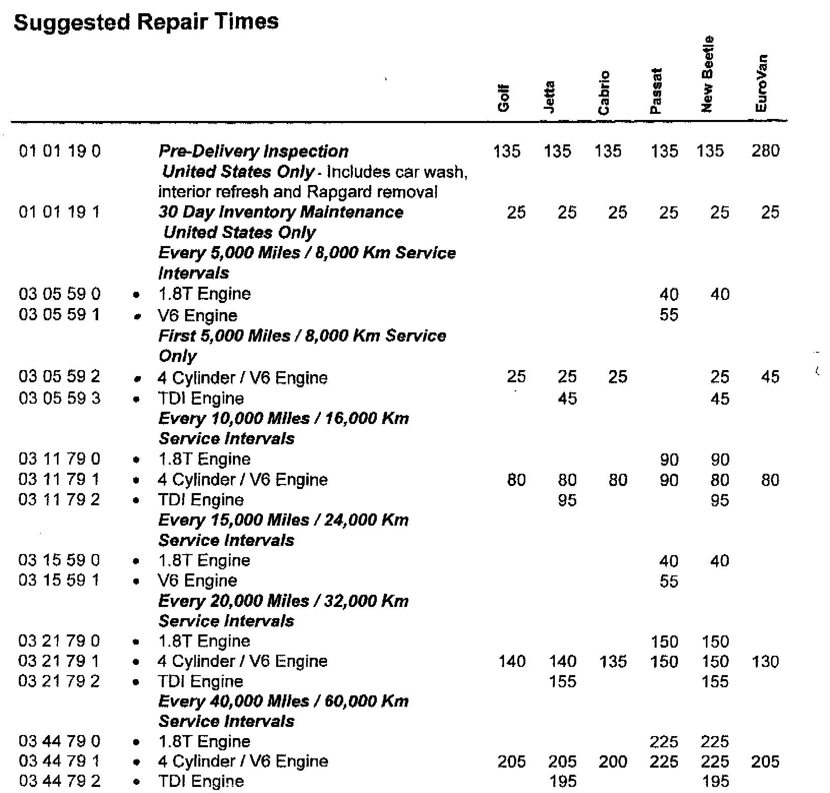 This Service Circular contains the Pre-Delivery Inspection Procedure, 30 Day Inventory and Maintenance/Lubrication Schedules for 1999 Model Year Volkswagen vehicles. Suggested Repair Times for these schedules are included. Note: Pre-Delivery Inspection and 30 Day Inventory Maintenance suggested repair times are applicable to United States only.