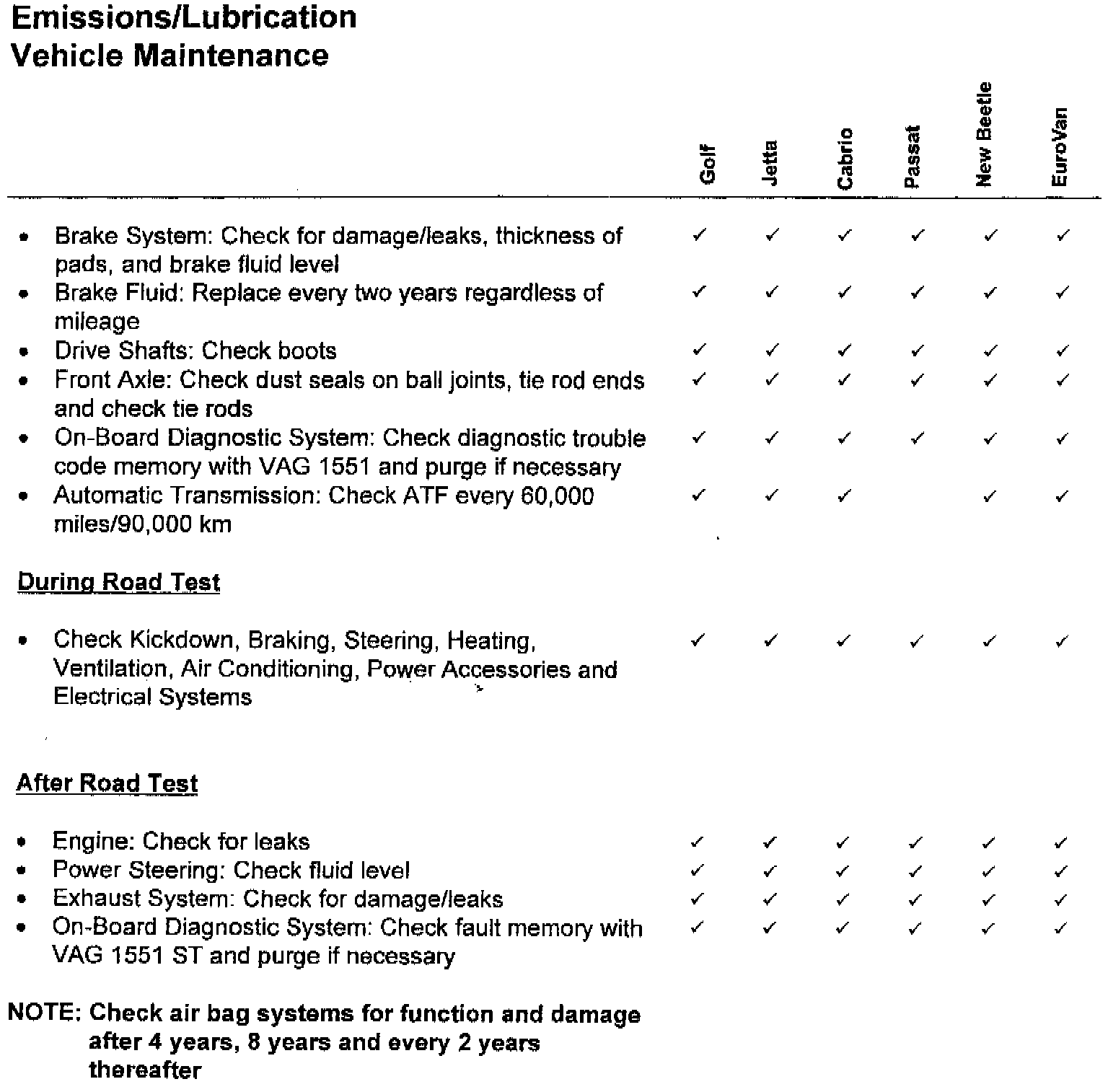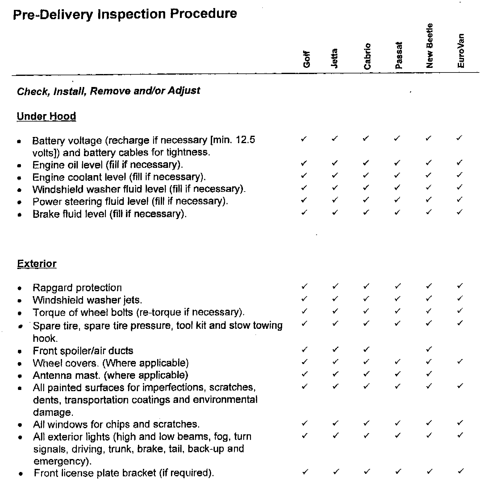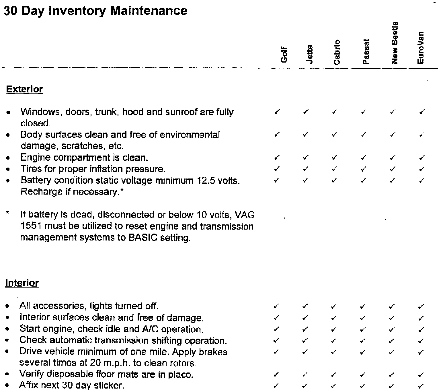 This Service Circular contains the Pre-Delivery Inspection Procedure, 30 Day Inventory and Maintenance/Lubrication Schedules for 1999 Model Year Volkswagen vehicles. Suggested Repair Times for these schedules are included. Note: Pre-Delivery Inspection and 30 Day Inventory Maintenance suggested repair times are applicable to United States only.
