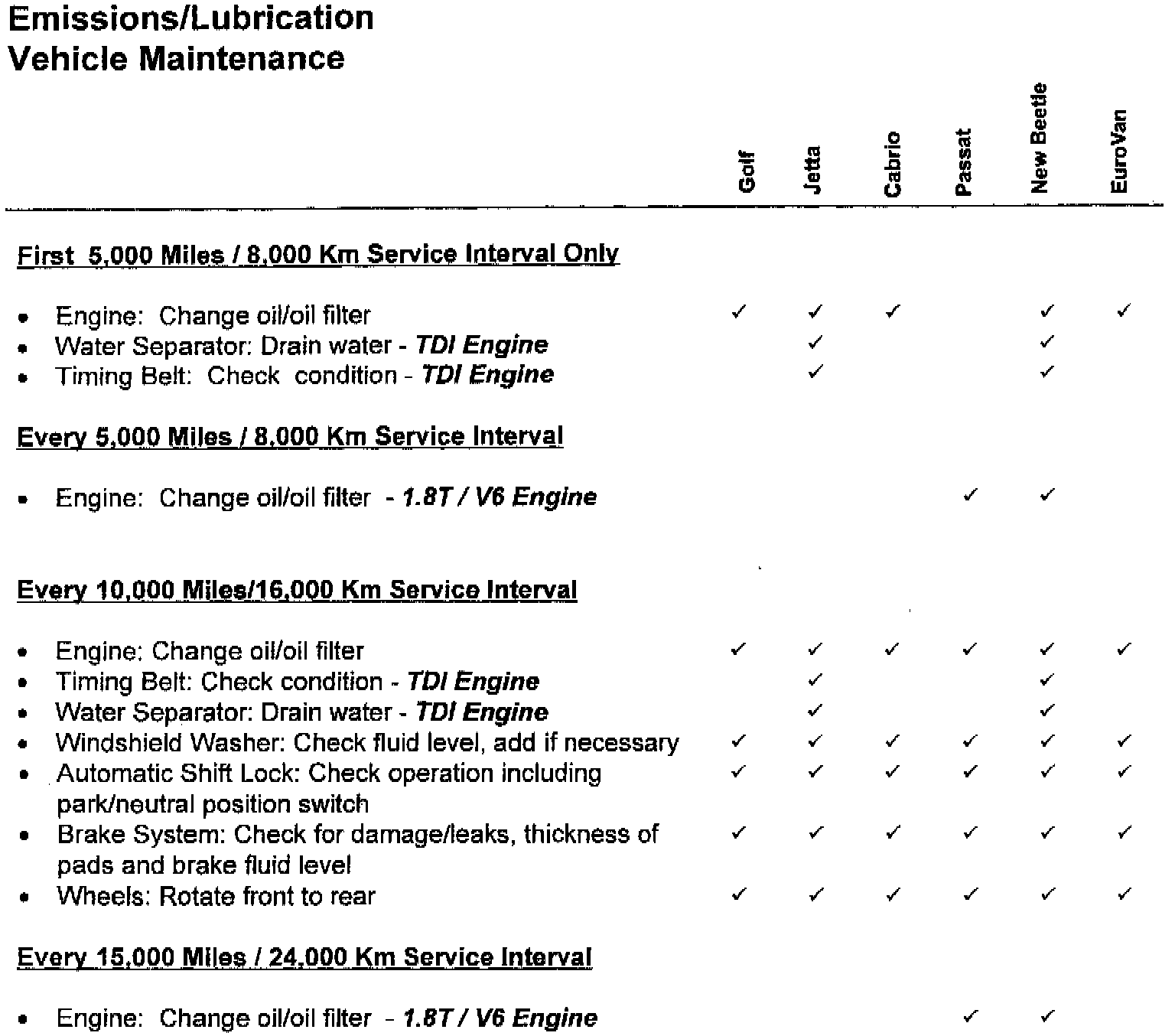 Lubrication/Emissions Vehicle Maintenance Schedule