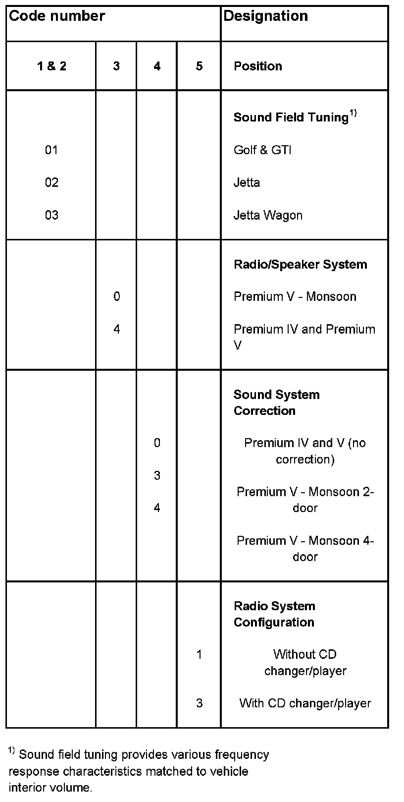 Coding example: 02403 = Jetta with radio system "Premium V" and CD changer