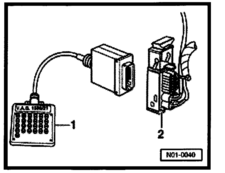 - Connect VAG 1598/21 test box -1- to ABS control module wiring harness -2-.