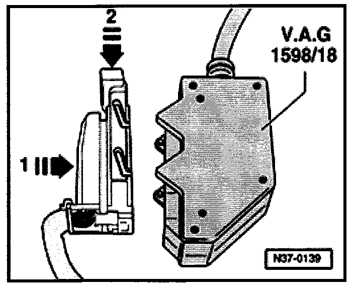 - Connect VAG 1598/18 test box to transmission control module wiring harness -1- and secure harness connector -2-.