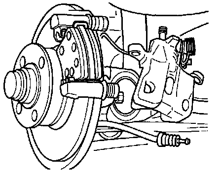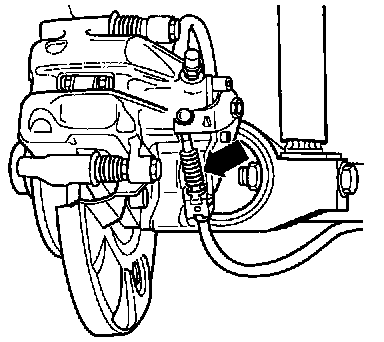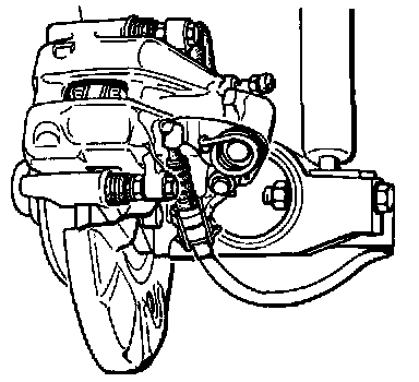 CAUTION: Do not allow the caliper to hang by the brake hose. The unsupported weight can stretch and damage the hose.