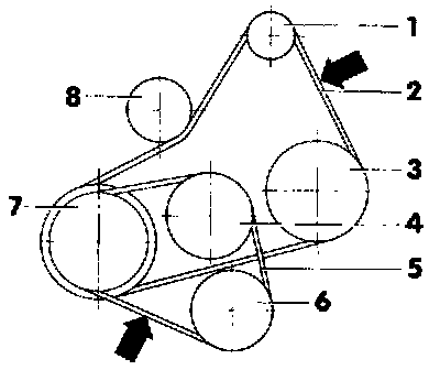 NOTE: Check belt tension at points indicated (arrows).