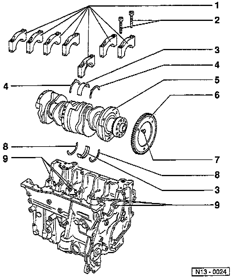 - Bearing shell retaining lugs on cylinder block bearing cap must be on the same side.