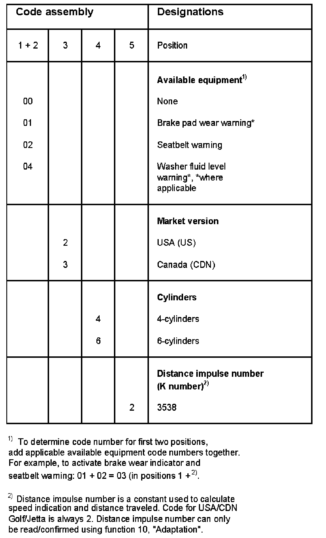 NOTE: The code table lists only those combinations applicable to Golf/Jetta through m.y. 1999.