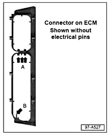 - Remove tabs on the ECM (arrows A and B) using a soldering pencil (view shows ECM connector without pins).