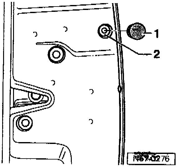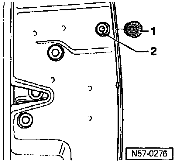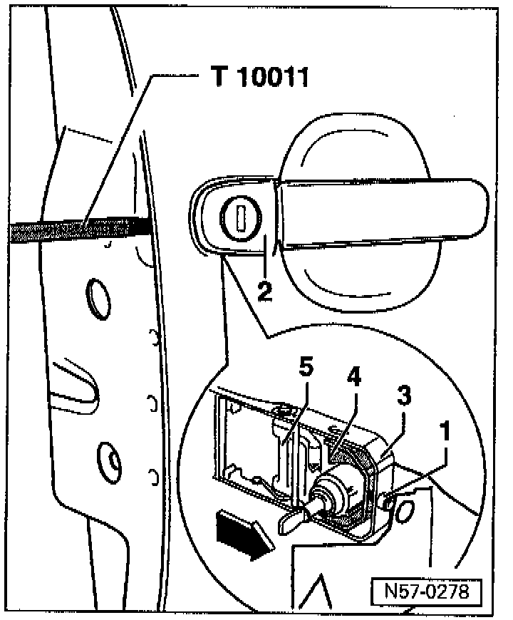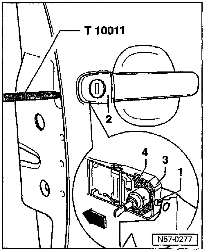 - Pull door handle and hold. Loosen screw -1- to stop with socket insert T 10011. (releases lock cylinder housing).