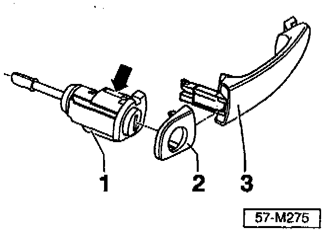 - Pull lock cylinder housing -2- from door handle bearing bracket at a right angle.