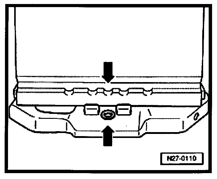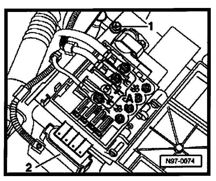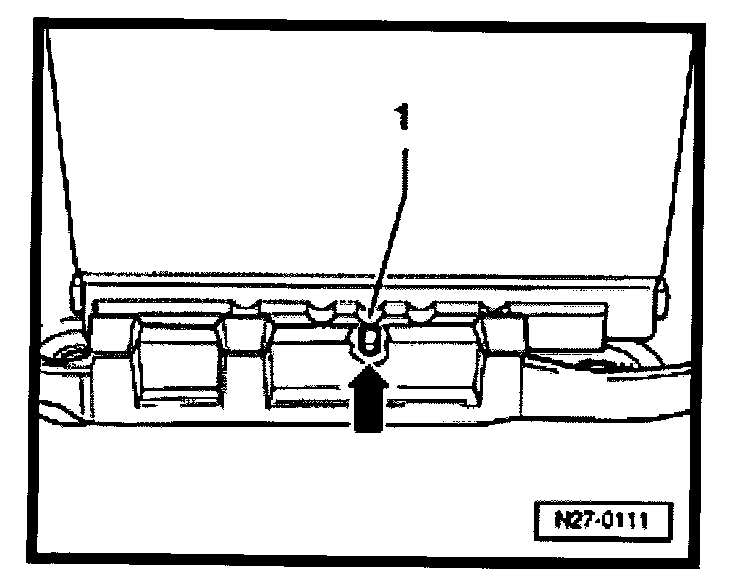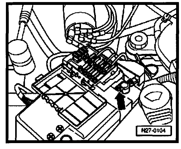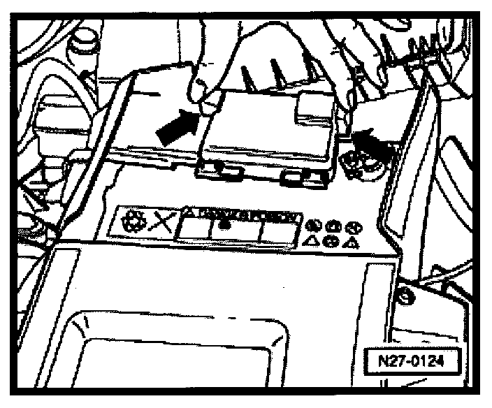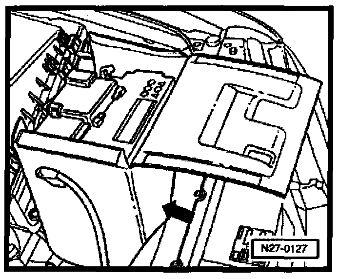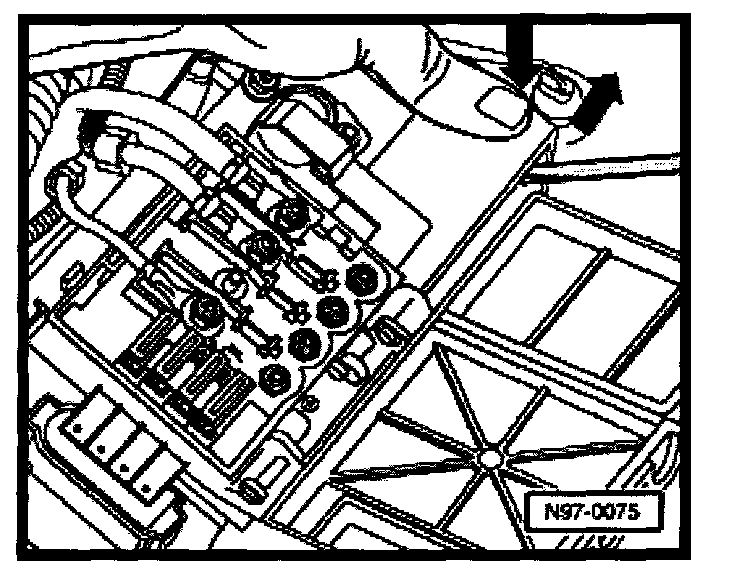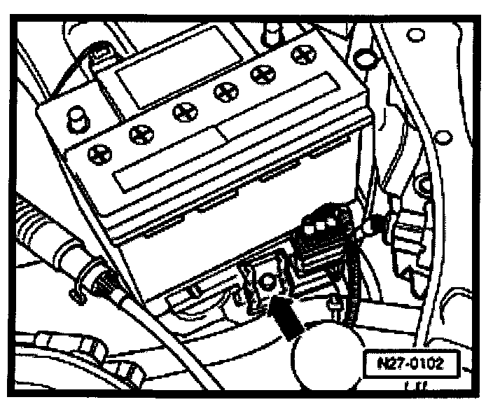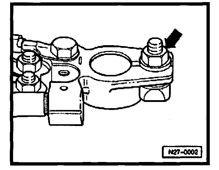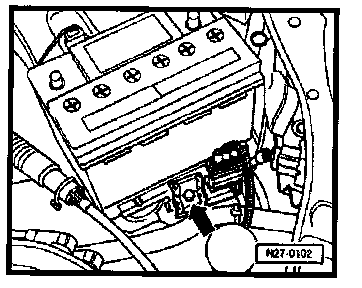- Install battery hold-down bracket -arrow- and tighten bolt to 22 Nm (16 ft lb).