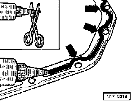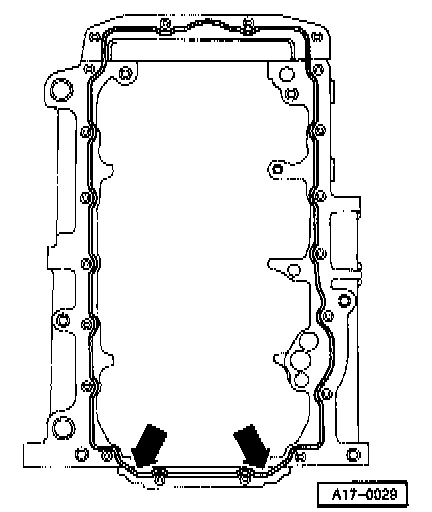 - Apply silicone sealing bead as shown to the clean sealing surface of the oil pan. (illustration shows position of sealant bead on engine block).